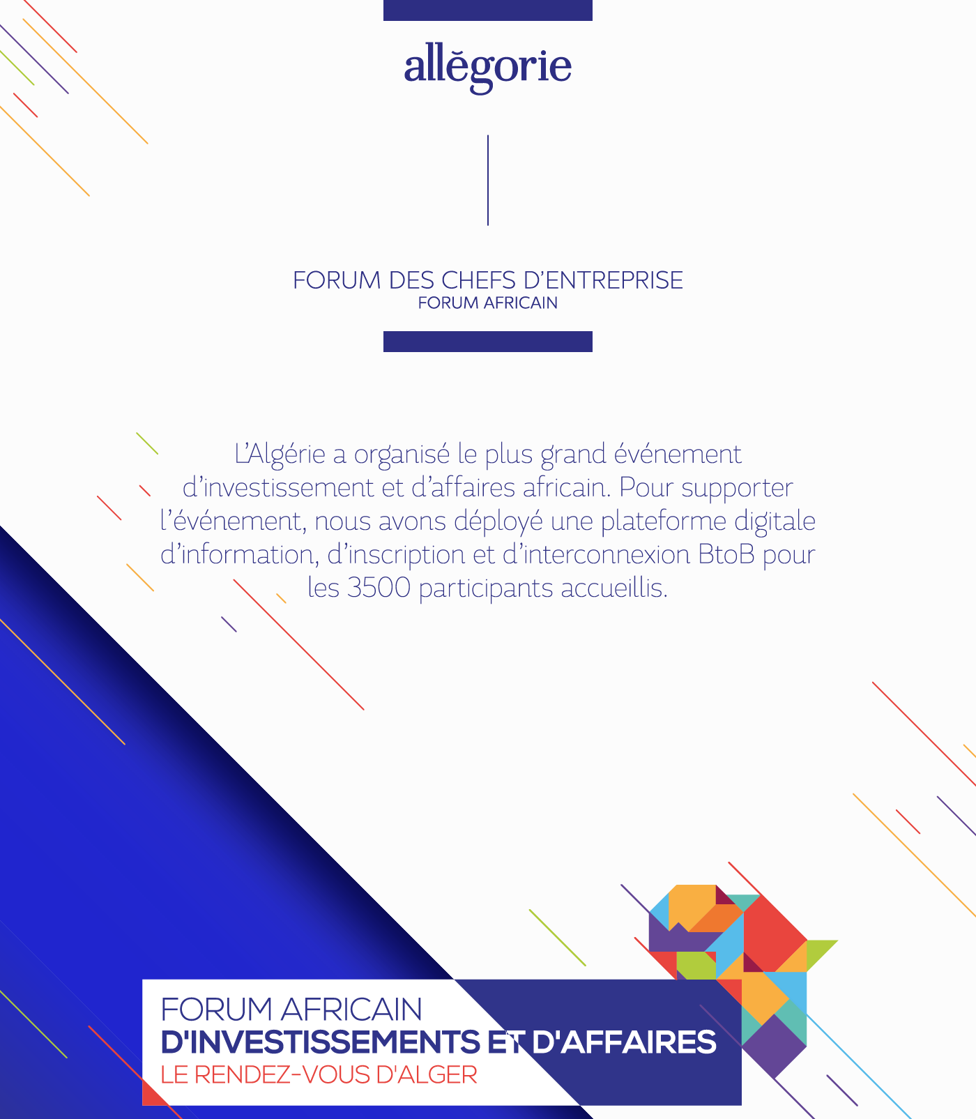 L’Algérie a organisé le plus grand événement d’investissement et d’affaires africain. Pour supporter l’événement, nous avons déployé une plateforme digitale d’information, d’inscription et d’interconnexion BtoB pour les 3500 participants accueillis.